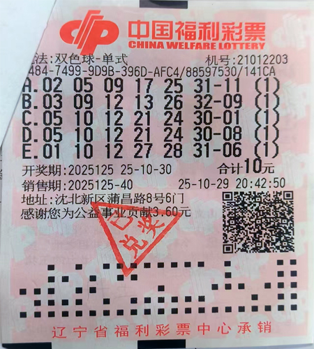 这注大奖出自沈阳市沈北新区蒲昌路8号6门的第21012203号福彩销售网点,购买时间为10月29日20点42分,中奖彩票为1张自选五注单式票,投注10元,中得头奖奖金5,742,924元。
