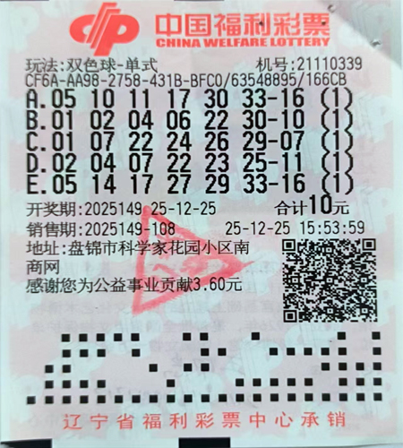 大奖出自盘锦市第21110339号福彩销售网点,地址为盘锦市兴隆台区科学家花园南侧7号商网,购买时间为12月25日15点53分,中奖彩票为一张机选5注,投注10元,其中第二注中得1注一等奖,奖金总额为6,418,616元。