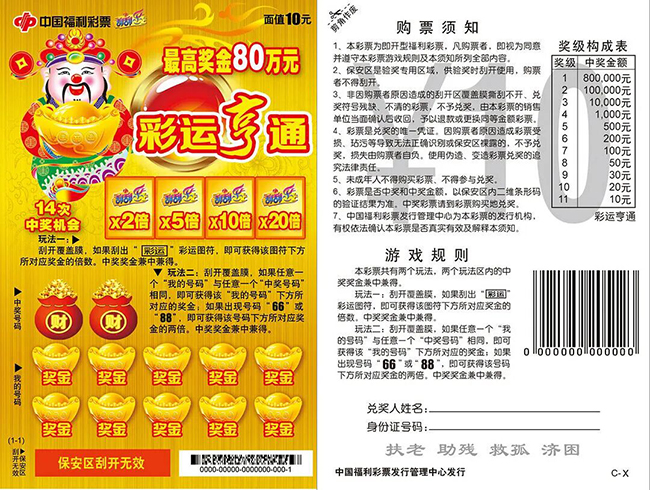 玩法介绍:彩票名称采用了“财运亨通”的谐音,画面以财神送金元宝为主体,吸引眼球。寓意财神带给广大彩民财富与好运。