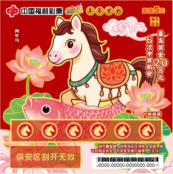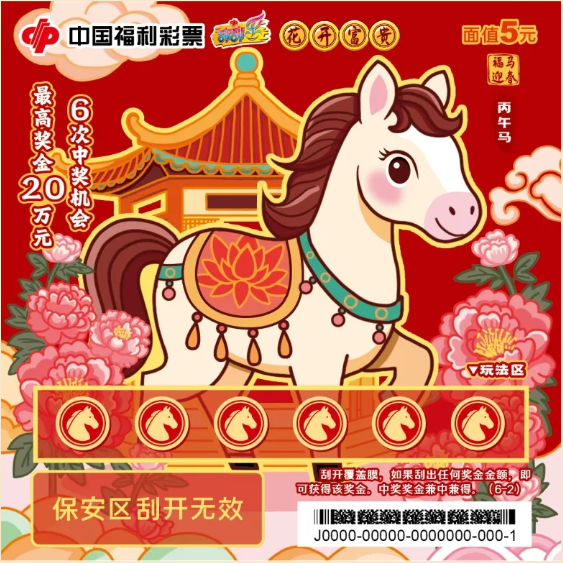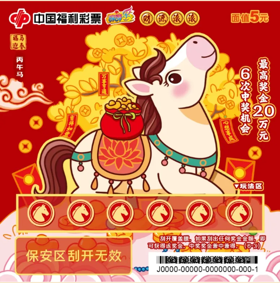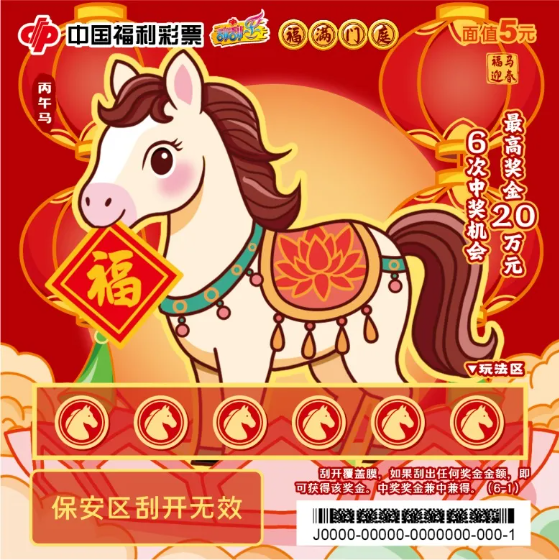 今年的“丙午马”生肖主题票包含五款游戏其中“福马迎春”面值为5元,6次中奖机会,最高奖金20万元。