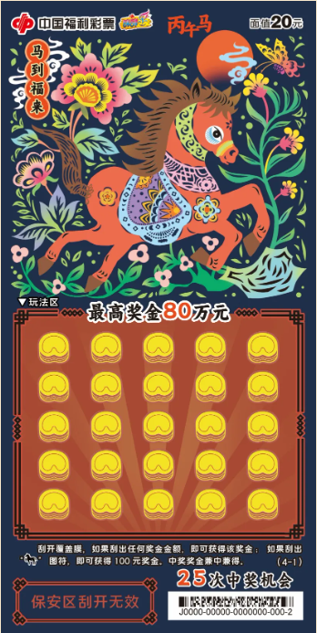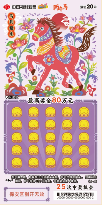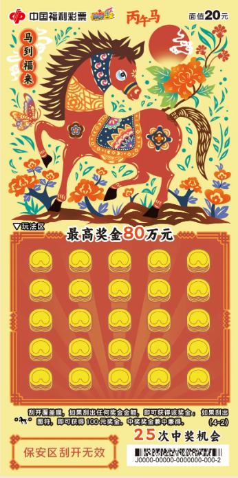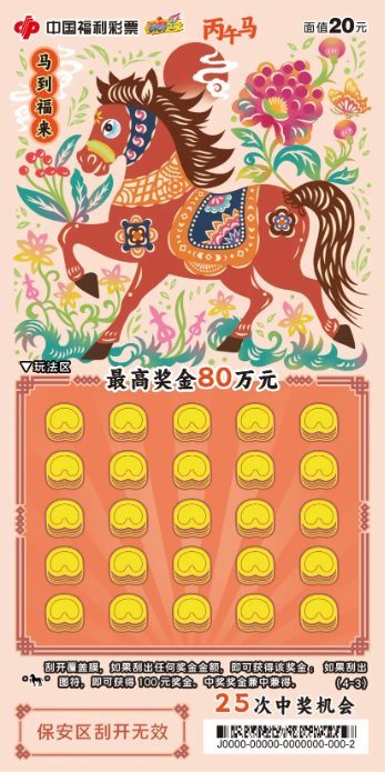 今年的“丙午马”生肖主题票包含五款游戏其中“马到福来”面值为20元,25次中奖机会,最高奖金80万元。