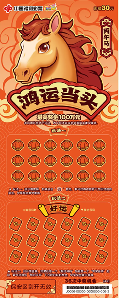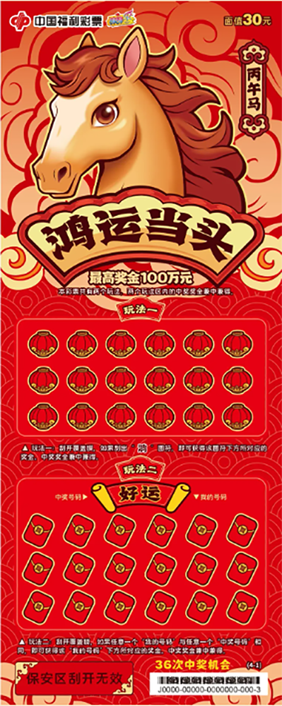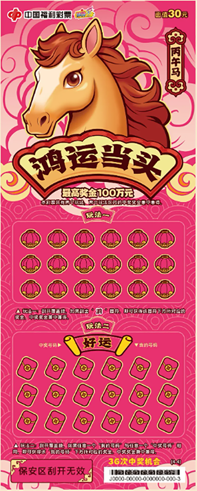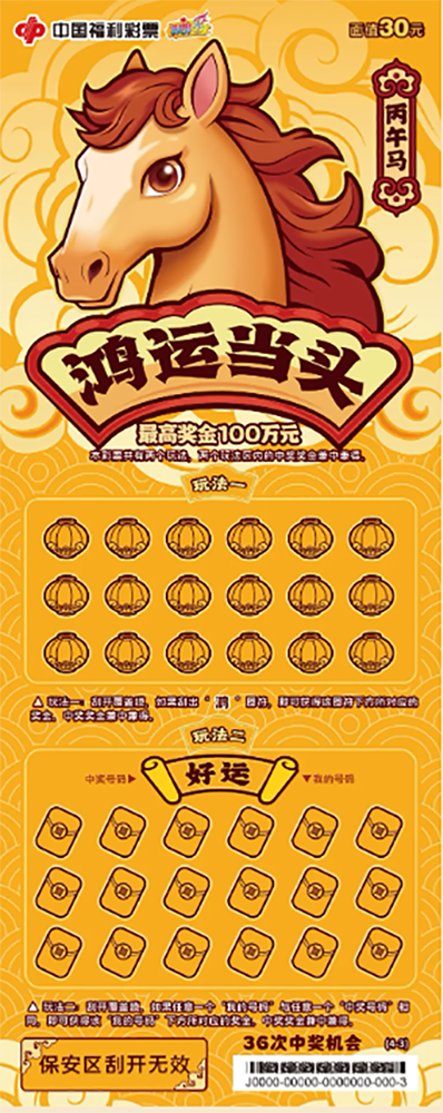 今年的“丙午马”生肖主题票包含五款游戏其中“鸿运当头”面值为30元,36次中奖机会,最高奖金100万元。