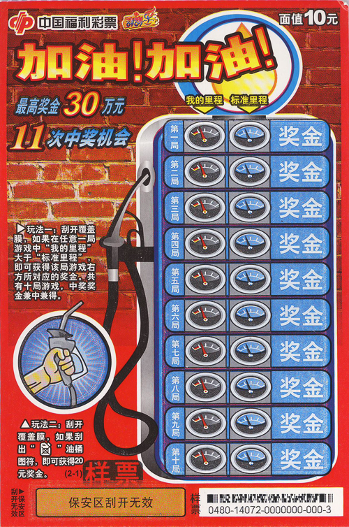 “加油!加油!”彩票每张面值10元,共11次中奖机会,最高奖金30万元。