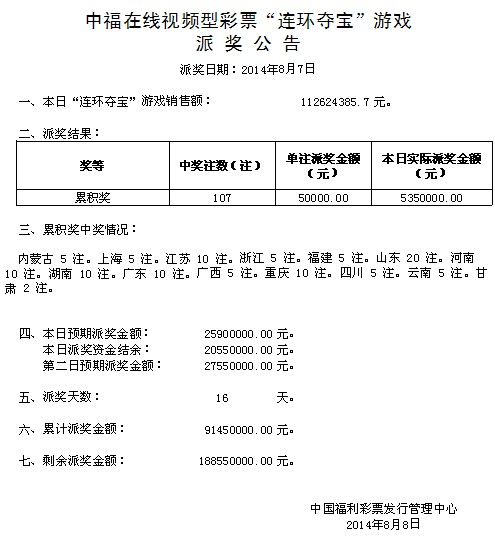 中福在线“连环夺宝”游戏派奖公告8月7日