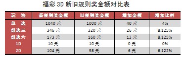 更高的返奖比例直接提高了3D游戏的奖金成色,调整后单选奖金由1000元/注,提高到1040元/注;组选三奖金由320元/注,提高到346元/注;组选六奖金由160元/注,提高到173元/注。