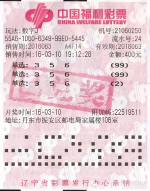 3月10日,福利彩票3D游戏第2016063期开奖,号码为“3 5 6”,位于丹东市元宝区临江街综合楼的250号投注站内,一位幸运彩民以一张共200注的单选倍投彩票,独揽20.8万元巨奖。