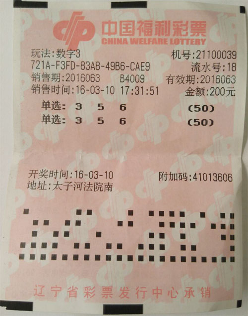 3月10日,福彩3D第2016063期开出的号码为“356”,辽阳一彩民张先生(化名)在辽阳市宏伟区福彩21100039号投注站投中100注单选,获得奖金10万元。
