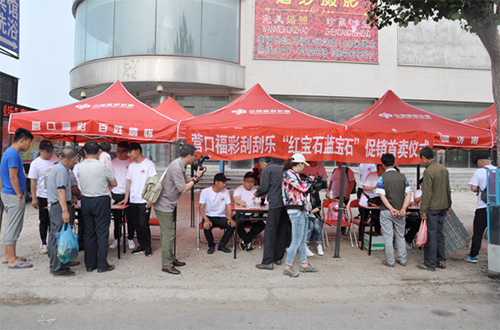 为了更好地开展此次促销活动、借助促销契机进一步完成刮刮乐全年销售指标、提升刮刮乐在销售市场的影响力,营口福彩于6月7日在盖州市万福镇集市开展刮刮乐“红宝石蓝宝石”促销首卖仪式。清晨六点,营口市福利彩票发行中心的全体干部职工准时从单位出发赶往盖州市万福镇,同时市中心还雇佣了一台LED大屏幕宣传车,将此次“红蓝宝石”派奖信息、音频广告及时向当地彩民进行宣传。早上8点,中心人员到达目的地万福镇集市,他们拉横幅、组装销售亭、贴海报、发传单……每位工作人员各司其职,有条不紊的做着销售前的准备工作。许多过往的人因好奇停驻脚步纷纷围拢过来,其中不乏从未接触过彩票的人,在工作人员的鼓动下他们加入了购彩行列成为福彩的新成员;还有些则是福彩的老彩民,被现场销售刮刮乐的热闹场景所吸引便也来沾沾喜气、试试手气……但不管是新成员还是老彩民,他们都在奉献爱心的同时收获了属于自己的快乐。热闹的销售现场充满了欢声笑语,彩民中奖的惊呼声时不时从人群中传来,使得购彩气氛异常高涨!