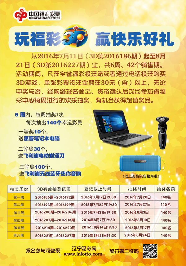 为回馈广大彩民对中国福利彩票3D游戏的关心支持,打造品牌形象,辽宁省福彩中心将于2016年7月11日起对3D游戏开展大型促销回馈活动,奖品丰厚,机会难得。