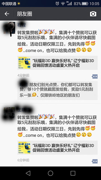 7月11日,“玩福彩3D,赢快乐好礼”活动开始第一天,铁岭市福彩中心为配合这次促销活动,发动全体职工,在微信朋友圈转发促销活动宣传细则,并采取积攒的方式给与转发的朋友以奖励,条件为转发并集齐10个赞就可以得到面值5元的“幸运星”刮刮乐一张,最高奖金是15万元,先到先得。
