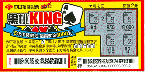 扑克是流行全世界的一种可娱乐的纸质工具,其玩法多种多样,更被广大民众所熟知。刮刮乐“黑桃king”正是这样一款借鉴扑克牌的花色之王“黑桃”为主题的即开型彩票,其画面与玩法相结合,带给彩民一种简单而有趣的中奖感受。