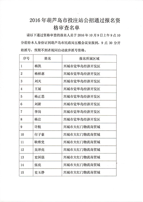 2016年葫芦岛市投注站公招通过报名资格审查名单