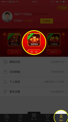 或者您也可以点击客户端右下角“我的”菜单,直接点击“摇摇晃晃”游戏头像,查看中奖明细,千万不要疏忽大意,让红包待在角落里哭泣哦~