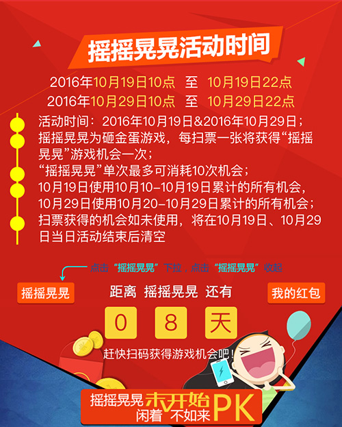 没关系,各位和小编一样运气不佳的小伙伴们别着急,毕竟属于我们的时间才刚刚开始~明天(10月19日)就是第一轮摇摇晃晃的游戏时间啦!每次游戏后都有机会立刻获得5元到50元(红包金额随机分布)不等的红包!之前扫过的票都是明天可以摇晃的金蛋啊!($﹃$),所以赶快拿起手机,跟小编一起get起来“摇摇晃晃”的游戏攻略吧!