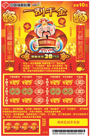 (促销活动主角——“一刮千金”刮刮乐,票面售价10元,最高奖金30万元!)