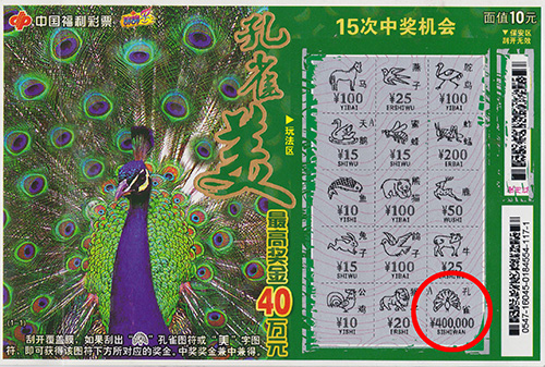 随后他拿起了第二张彩票,刮开兑奖区覆盖膜的速度较之前明显放缓了许多,仔细核对中奖图符,第1次中奖机会,未中;第2次也未中;第3次,还是未中……第14次依然未中,眼看15次中奖机会即将全部刮完……然而,惊喜往往总是藏在最后:当最后一次中奖机会的覆盖膜被慢慢刮开时,一个“孔雀开屏”的图符逐渐显现出来,下方对应的奖金金额是“ ¥ 400,000”!