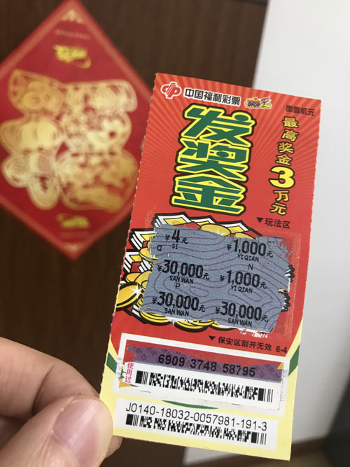 福彩刮刮乐“发奖金”玩法面值2元,最高奖金3万元。玩法简单,只需刮开玩法区,如出现3个相同的数字,即可中得此数字金额的奖金,共设9个奖级,中奖奖金兼中兼得。