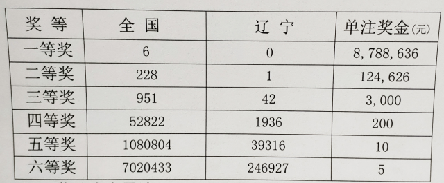 辽宁中出的1注二等奖出自抚顺286号投注站,单注奖金124,626元。