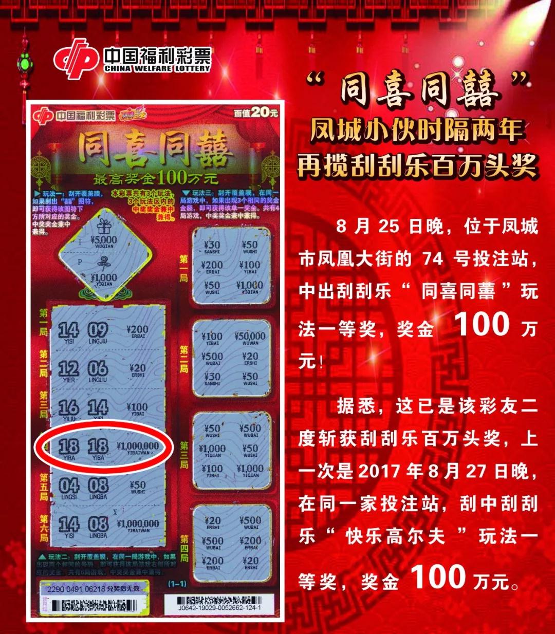 8月25日晚,位于凤城市凤凰大街的74号投注站,中出刮刮乐“同喜同囍”玩法一等奖,奖金100万元!