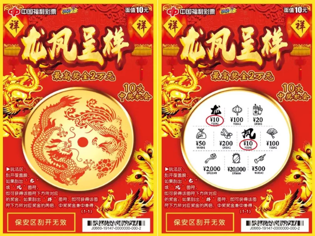 游戏规则:刮开覆盖膜,如果刮出“龙”或“凤”图符,即可获得该图符下方所对应的奖金;如果刮出“祥”图符,即可获得该图符下方所对应奖金的两倍,中奖奖金兼中兼得。