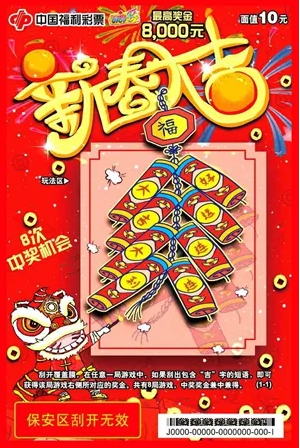 刮刮乐“新春大吉”面值10元,共有8次中奖机会,最高奖金8000元。本款票面设计以红、黄为主色调,采用鞭炮、醒狮、烟花等新春元素,明亮喜庆;采用“文字”即中游戏,浓缩中国传统文化精华的四字成语。