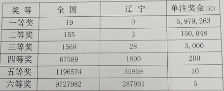 全国二等奖开出155注,单注金额15万多元。当期末等奖开出972万多注。辽宁中出3注二等奖,其中大连1118号站中2注,阜新118号站中1注。