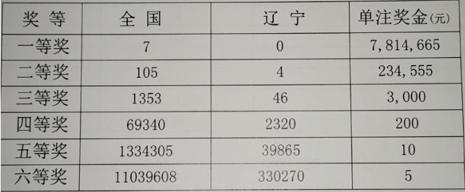全国二等奖开出105注,单注金额23万多元。当期末等奖开出1103万多注。辽宁中出4注二等奖,其中沈阳180号站1注,大连630号站3注。