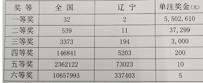 全国二等奖开出539注,单注金额3万多元。当期末等奖开出1065万多注。辽宁中出11注二等奖。