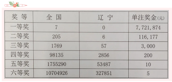 当期全国二等奖开出205注,单注奖金11万余元,其中辽宁喜中6注二等奖,出自沈阳2550号站中1注,大连278号站中1注,营口178号站中1注,辽阳307号站中1注,铁岭23号站中1注,朝阳 151号站中1注。