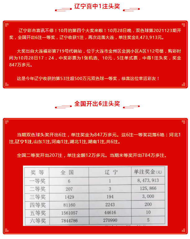 双色球第123期:头奖6注847万,辽宁喜中1注
