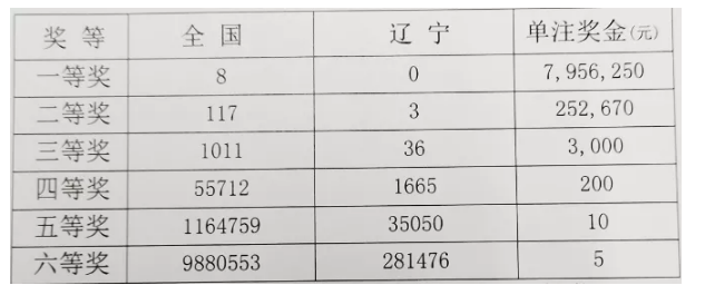 全国二等奖开出117注,单注金额25万多元。当期末等奖开出988万多注。辽宁中出3注二等奖,其中沈阳1392号站1注,大连211号站1注,丹东37号站1注。