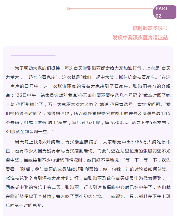 10月27日,39号站站主张淑丽带领数名领奖代表兴高采烈地来到省福彩中心兑奖。据了解,这次参与合买的成员有些是购买彩票十几年的资深购彩者,也有一些是彩市新手,他们相互并不是很熟悉,把他们聚集到一起的,正是站主张淑丽。